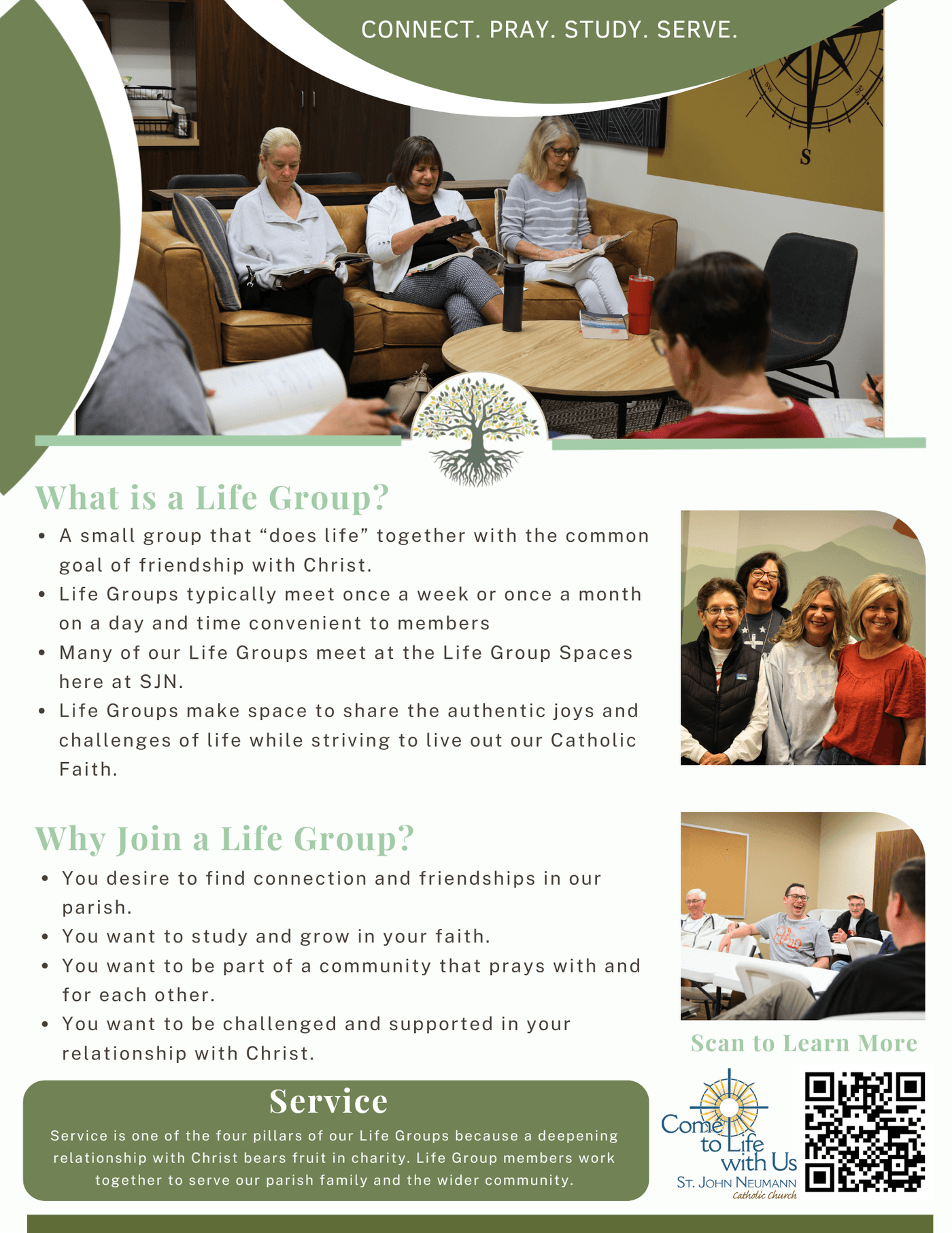 Life Groups are small groups dedicated to connecting, studying, praying, and serving.